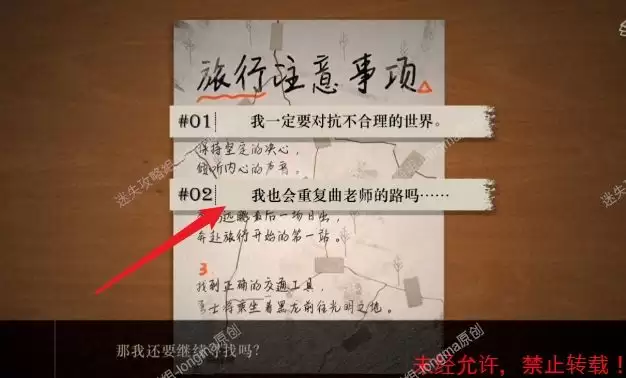 1、在第二章即将结束时,当出现选项“02 我也会重复曲老师的路吗......”,请务必选择它(即选项1)。这个选择会悄然改变第三章的走向。