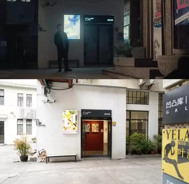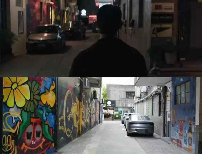 罗梁发现颜聆时,背景中色彩鲜明的涂鸦墙正是M50入口标识。他转身的位置,实为厘米空间画廊门前。
