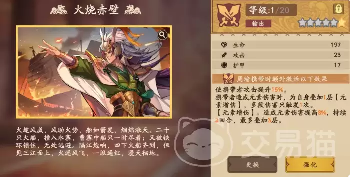 为周瑜选择溯影,核心思路是最大化其火系爆发与持续作战能力。首选方案无疑是【火烧赤壁】:它不仅提供15%的攻击加成,更关键的是,在造成火元素伤害时能叠加1层“元素真伤”印记(每场战斗生效一次),每层提升8%火伤,两回合内最高可叠加至3层,综合增益非常显著。
