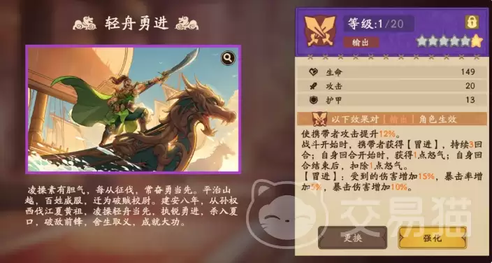 如果暂时没有获取【火烧赤壁】,那么【轻舟勇进】是一个优质的替代方案。它提供12%攻击加成,并赋予“冒进”状态——周瑜行动开始时恢复1点怒气,行动结束后扣除1点怒气。在此状态下,敌方受击伤害增加10%,而周瑜自身则需承受15%的额外伤害,同时获得5%暴击率和10%暴击伤害的提升。这是一条典型的“以攻代守”强化路径,适合追求极限爆发的阵容搭配。