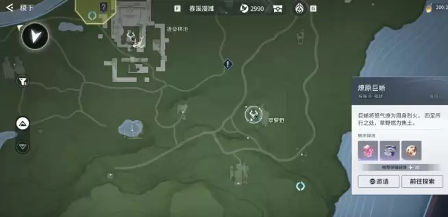 第一步,是找到它。打开大地图,燎原巨蜥的位置非常清晰,通常位于场景中段偏右的区域。那片焦黑的土地和燃烧的痕迹,就是最显眼的路标。开打前,队伍配置是关键:请务必带上东方曜和伽罗这两位英雄,并确保他们的技能都已准备就绪。