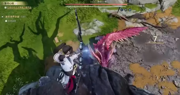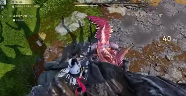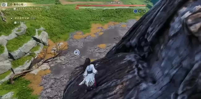 接下来是关键操作:从平台上垂直跳下去。这个简单的下落动作,会触发一个有趣的机制:燎原巨蜥的仇恨会牢牢锁在东方曜身上,同时,由于模型碰撞和地形边缘的“默契配合”,BOSS会被卡在树根与地面的交界处。结果就是,它既无法移动,也放不出任何需要近身的技能,瞬间变成一只“活靶子”。