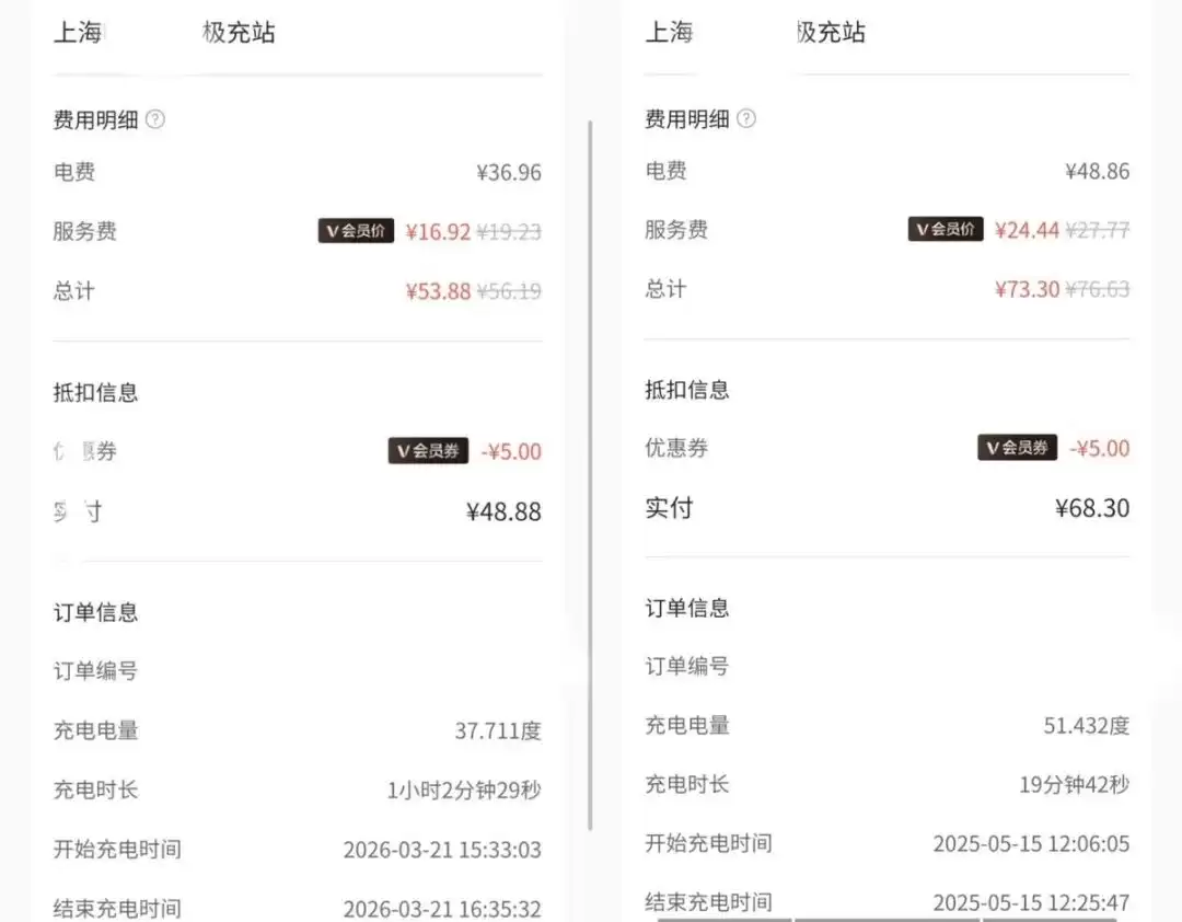 由此可见,对于高频使用的营运车辆而言,充电费用的上涨尚未构成普遍压力。那么,在商业办公场景下情况如何?答案同样复杂。以笔者亲历为例,在同一写字楼的固定充电桩,去年充电51.43度,费用68.3元,单价约1.32元;今年充电37.71度,支付48.88元,折合单价约1.29元——由于各类优惠券抵扣,实际支出反而有所降低。