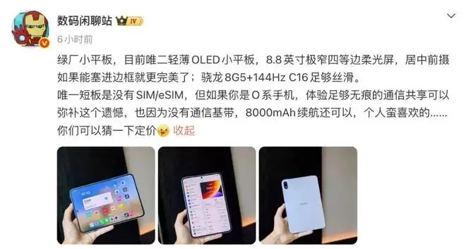 这款被称为“绿厂小平板”的新品,是目前轻薄OLED平板市场中一个颇具竞争力的选项。它配备了一块8.8英寸极窄四等边柔光屏,居中前置摄像头设计若能进一步缩窄边框,屏占比将更具冲击力。核心性能上,骁龙8 Gen5移动平台与144Hz高刷新率屏幕的组合,确保了流畅的操作与影音游戏体验。