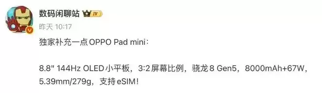综合现有爆料,OPPO Pad Mini的核心配置已基本清晰。它搭载8.8英寸144Hz OLED屏幕,屏幕比例为3:2,采用骁龙8 Gen5移动平台,内置8000mAh电池并支持67W有线快充。机身厚度仅为5.39mm,重量约279g,在便携性方面做出了显著优化。