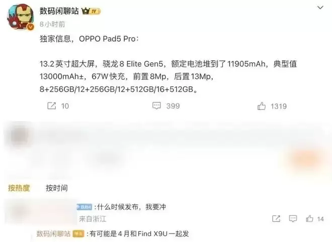 同期发布的OPPO Pad 5 Pro定位更为高端。爆料显示其可能配备13.2英寸超大屏幕,搭载骁龙8 Elite Gen5芯片。其电池容量是主要亮点,额定容量达11905mAh,典型值约13000mAh,并支持67W快充。影像方面,前置800万像素镜头,后置1300万像素镜头。存储组合提供8+256GB、12+256GB、12+512GB及16+512GB多种选择。