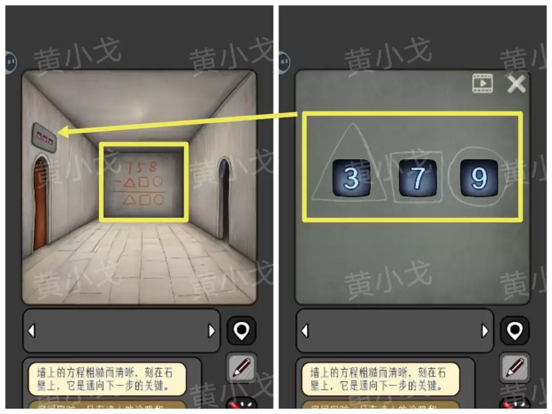 1. [门]点击密码锁,界面提示为图形(△□○)。结合墙上等式“758-△□○=△□○”解析:该等式等价于“758 = 2 × △□○”。因此,密码即为758除以2的结果:379。