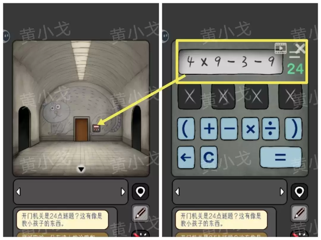 5. [猫]点击墙上密码锁,完成24点计算。使用数字4、9、3、9,一个有效的算式是:4 × 9 - 3 - 9 = 24。注意,算式应保持简洁,避免因过长导致系统误判。