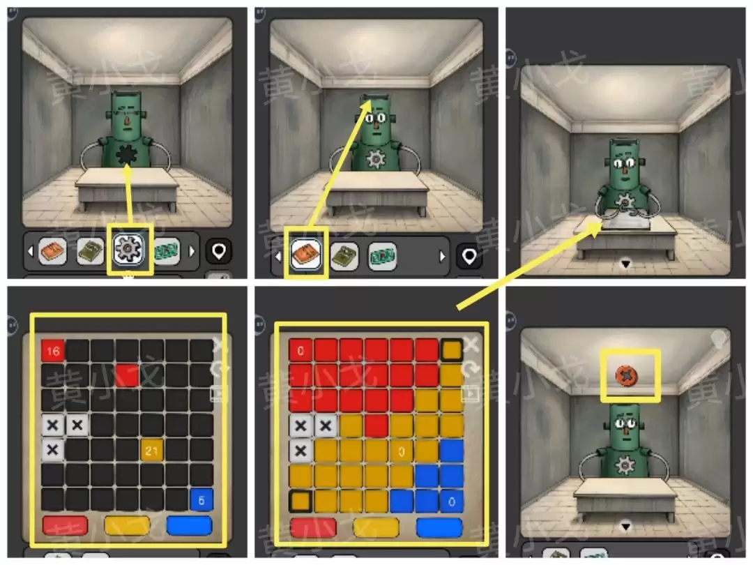 20. [绿色机器人]首先为机器人安装【齿轮】,随后交付【红色的书】。点击旁边游戏机,完成颜色顺序小游戏(正确顺序:红红红蓝蓝黄黄黄黄黄黄),获得【➕按钮】。