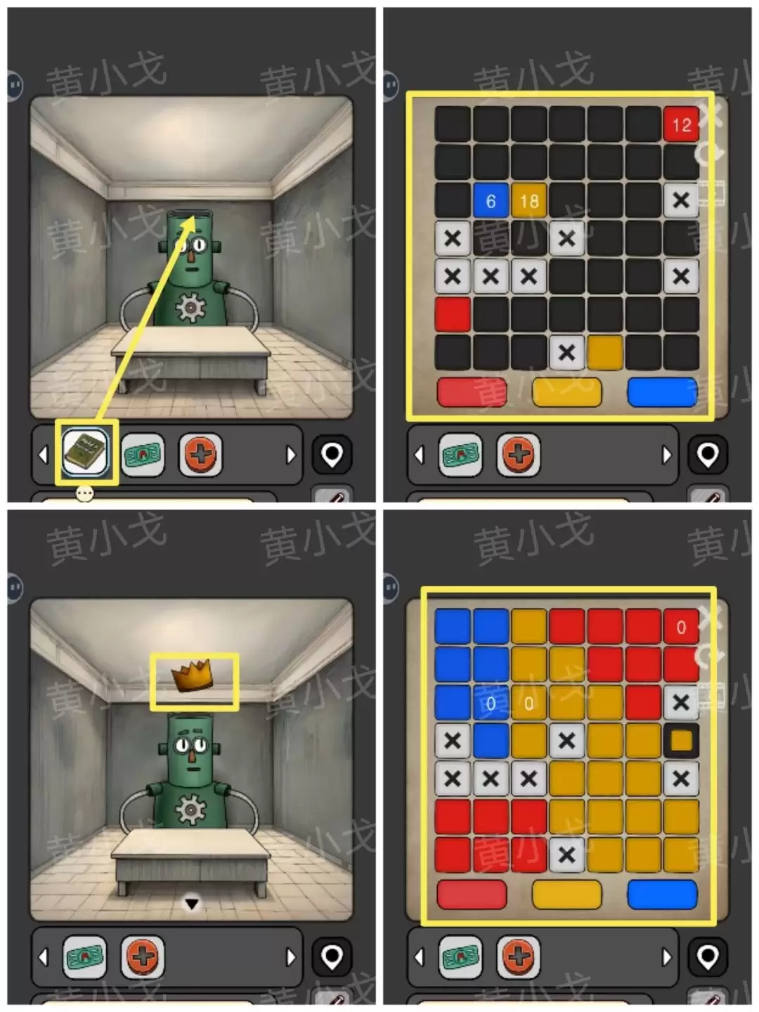 21.接着,将【绿色的书】交给同一机器人。再次操作游戏机,完成第二个颜色顺序游戏(正确顺序:蓝黄黄蓝蓝红红红黄黄黄),成功后获得【皇冠】。