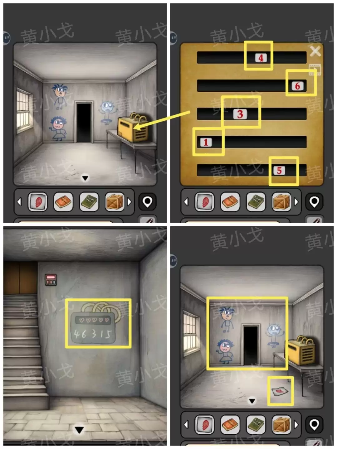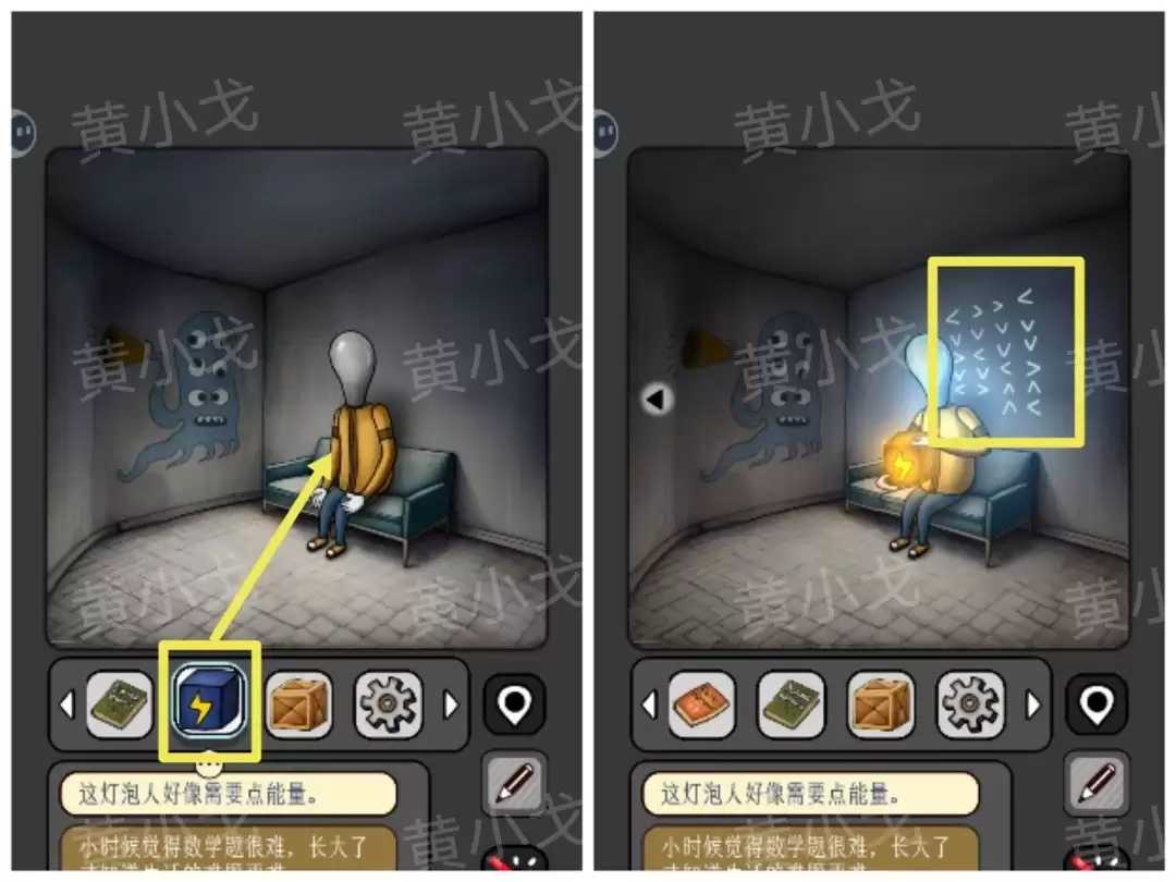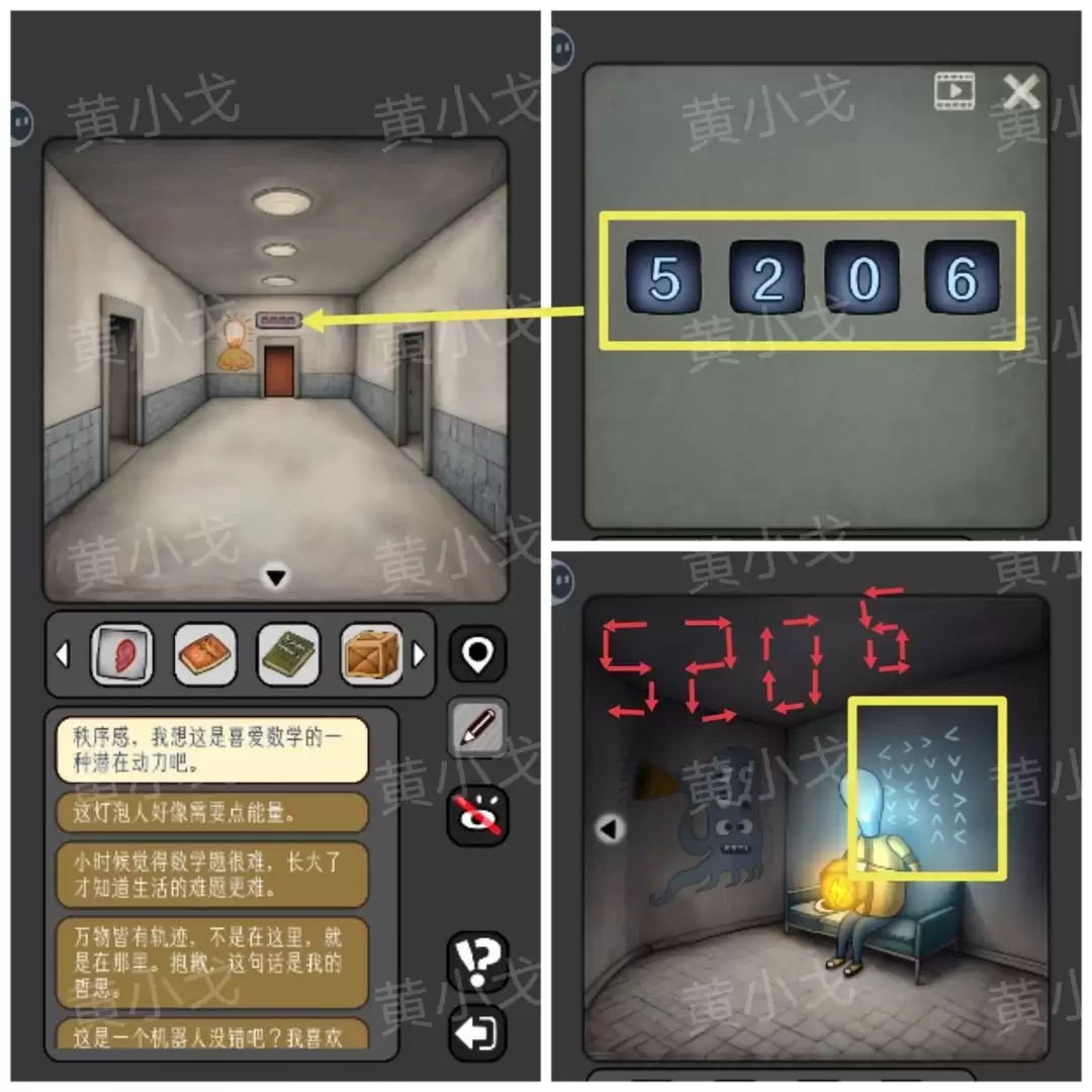 16. [灯泡图案]点击门锁,锁面灯泡图案需结合[灯泡人]场景墙上图案解读。解密逻辑是“沿箭头方向连接灯泡”,可得到4组数字,构成密码:5206。