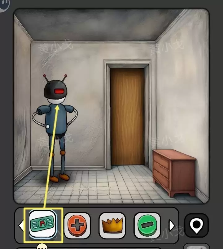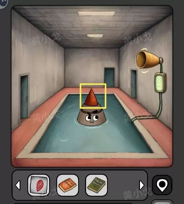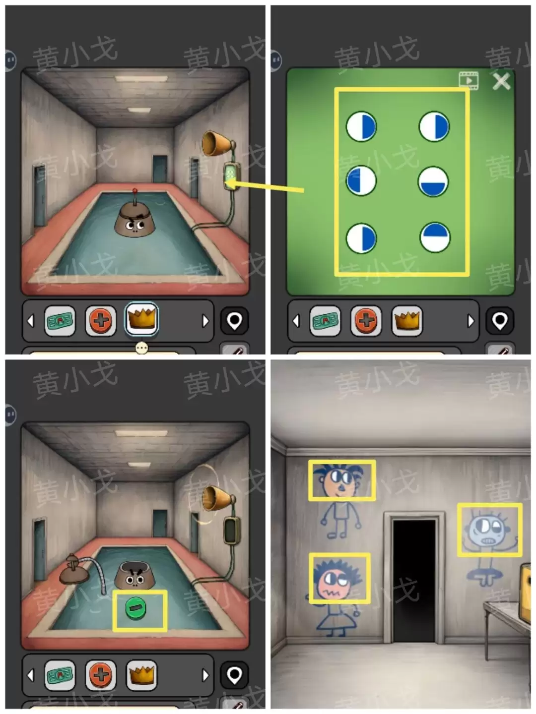 22. [泳池]再次点击装置机关,本次需依据[打印机]场景记录的眼睛朝向涂鸦(右右,左下,右上)进行解锁,获得【➖按钮】。