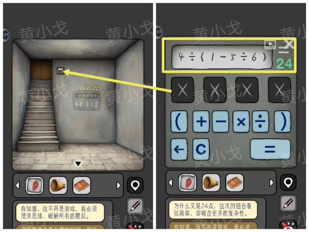 7.点击本场景墙上的密码锁,完成另一道24点谜题。使用数字4、1、5、6,一个可行的算式是:4 ÷ (1 - 5 ÷ 6) = 24。需使用全部四个数字,且表达式不宜复杂。