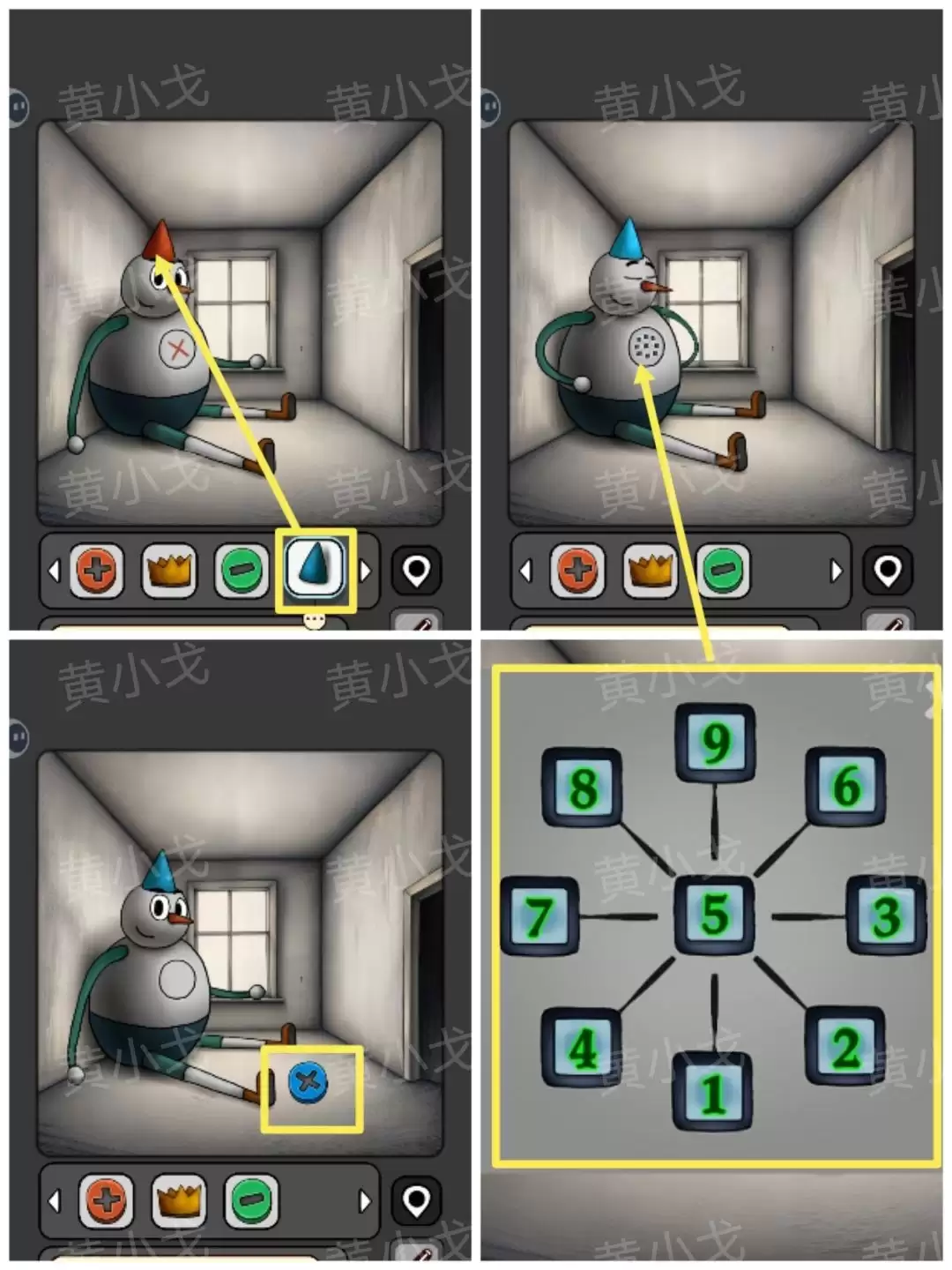 26. [雪人机器人]将【蓝色三角帽】交给机器人。点击其胸前机关,完成九宫格游戏(规则:横、竖、斜三数之和均为15)。破解后获得【✖️按钮】。