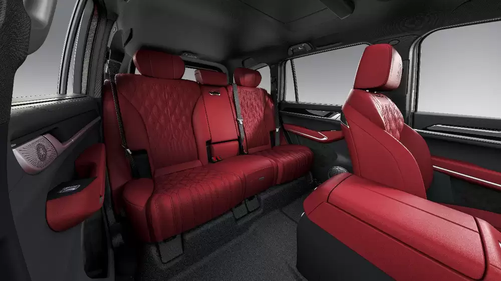 视觉呈现上,新车内饰基于“黑甲赤韵”的构思,采用定制深红色调的Nappa真皮座椅,并辅以精致的菱格绗缝工艺。这与全黑的车顶内衬形成层次分明的视觉反差,在极致豪华格调之外,也为马年征程注入了“红”运当头的吉祥寓意。