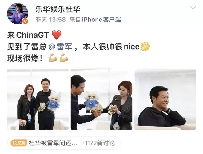 近日,乐华娱乐创始人杜华现身中国超级跑车锦标赛现场。她在个人社交账号发布了一张与小米集团创始人雷军的合照,并配文评价道:“雷总本人非常帅气且极具亲和力,现场赛事氛围也格外热烈。”