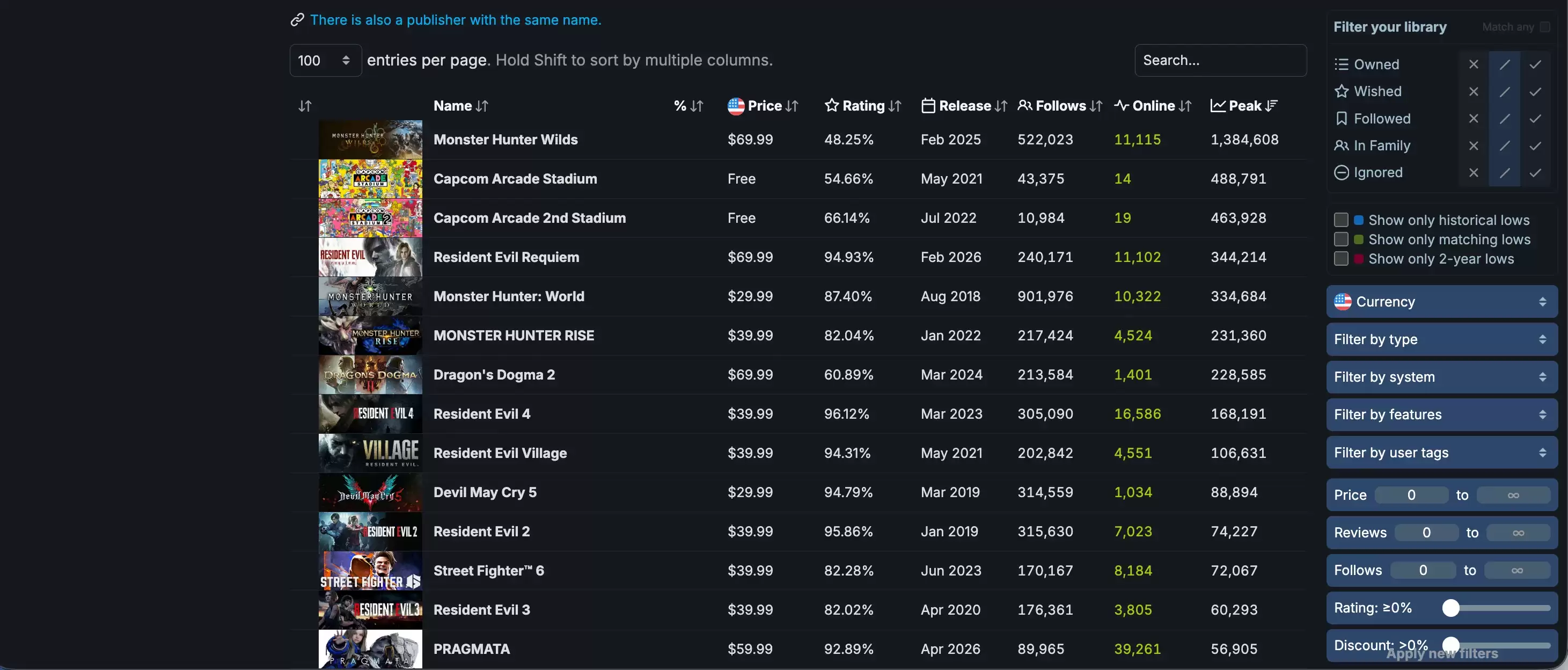 这里需要特别说明一下,《Capcom Arcade Stadium》系列游戏本身可以免费获取,其扩展包价格也相对亲民,因此它们的统计数据具有一定的特殊性,不能完全与买断制游戏直接类比。