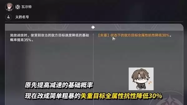 【星魂4】(辅助向)改动堪称质变。旧版“提高战技减速触发的基础概率”被替换为“使处于【失重】状态的敌人,全属性抗性降低30%”。