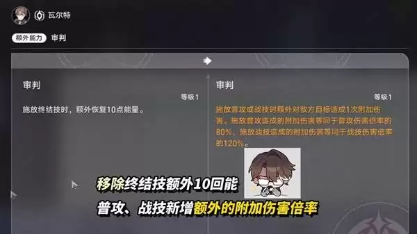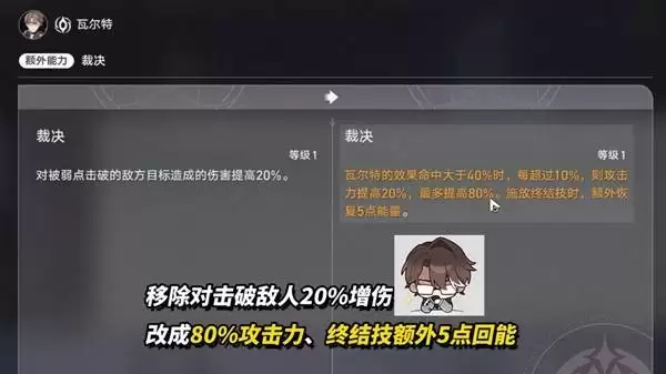 【额外能力·裁决】也迎来了重做。旧版“对弱点击破敌人造成20%额外伤害”的效果被替换为:施放终结技时额外回复5点能量;当瓦尔特的效果命中达到80%时,将额外获得80%攻击力加成。