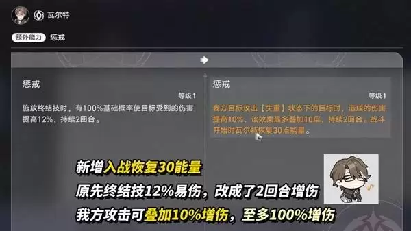 【额外能力·惩戒】效果彻底改变。旧版的“终结技命中添加12%易伤”被移除,取而代之的是两个新效果:战斗开始时恢复30点能量;我方角色攻击处于【失重】状态的目标时,会为攻击者提供一层10%的增伤效果,最多可叠加10层(即100%增伤)。