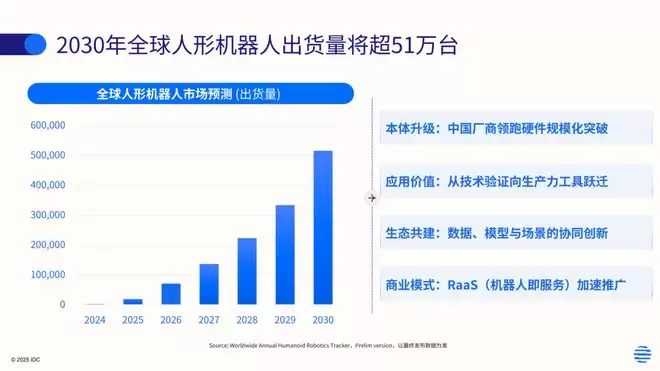 市场数据迅速印证了这一趋势。IDC最新预测指出,到2030年,全球人形机器人出货量预计将突破51万台,年复合增长率接近95%。一个具备明确增长路径的百亿级市场正在快速形成,其背后的驱动力来自制造业自动化升级与劳动力结构转型的迫切需求。