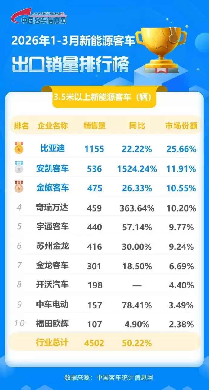 中国新能源客车出口格局已进入稳定期,头部优势日益凸显。根据中国客车信息网发布的2026年3月数据,比亚迪新能源客车出口量再次位居行业第一,其21.52%的同比增长率显著高于行业均值,成为驱动市场增长的核心力量。综合第一季度表现,比亚迪以1155辆的总出口量,占据了25.66%的市场份额,稳居榜首。值得注意的是,比亚迪是业内唯一单季度出口量突破千辆的制造商,这标志着其已连续三年蝉联中国新能源客车出口冠军。