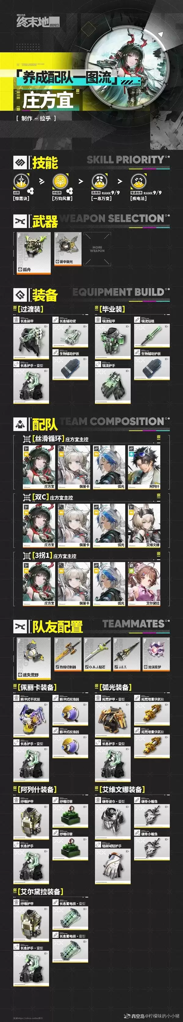 这张图可以说把核心信息都浓缩到位了。咱们先看装备部分。对于庄方宜而言,武器的选择直接关系到她的输出模式。是追求极致的技能爆发,还是保证稳定的持续伤害?图里给出的推荐方案,显然是经过实战检验的。具体来说,那把能显著提升技能伤害的武器,几乎是她的毕业首选,这能让她在关键时刻的爆发力上一个台阶。