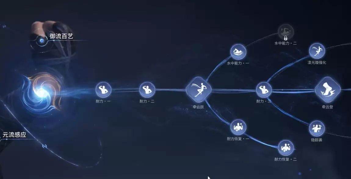 分支部分,可以从“牵云跃”开始规划。第一个分支,优先点满下方线路。点满后,体力恢复速度会得到显著提升,探索时的续航压力将大大减轻。第二个分支,则推荐点满上方线路,它能大幅强化角色的滞空能力,让你在空中停留更久,极大地提升了立体移动的灵活度。剩下的分支节点,可以根据个人的操作习惯和偏好来自由选择,没有严格的固定顺序。