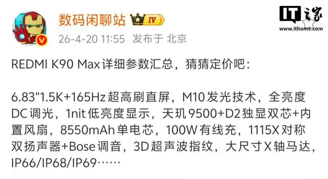 综合来看,Redmi K90 Max在性能释放、散热续航以及综合体验配置上,均展现出了旗舰级的堆料水准。最终的定价策略,将成为明晚发布会最大的悬念。