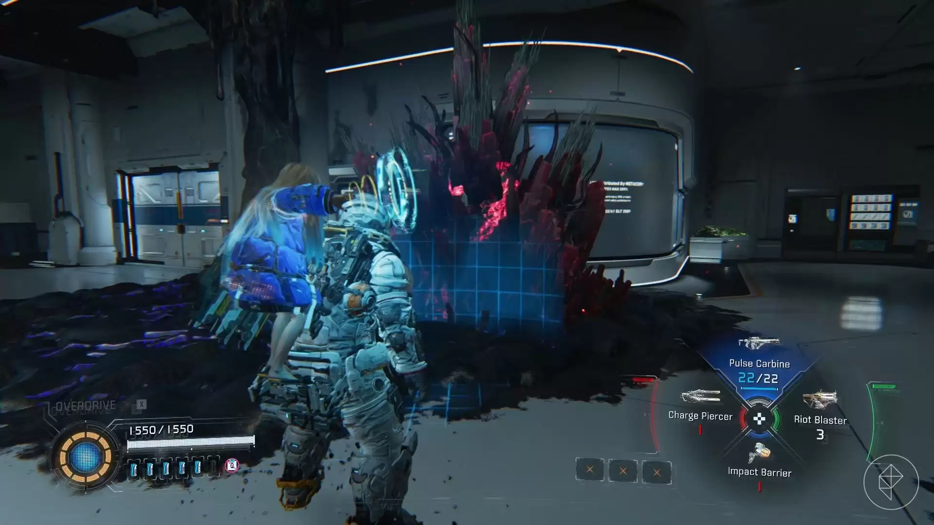 继续深入,进入下一个房间,最终抵达反应堆。当你拿到它时,四个步行者和一个枪骑兵会接连出现。击败所有敌人,然后将Diana带到下一个区域,触发过场动画。之后,把Diana放回桌子上,开始另一段动画。