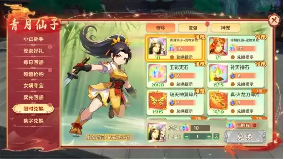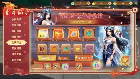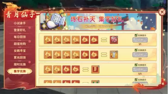 带有收集乐趣的长期任务。活动期间,留意收集“炼”、“石”、“补”、“天”、“救”、“世”这六个字。道理很简单,收集的数量越多,最终兑换的奖励就越豪华。