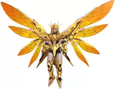 这款翅膀的整体设计以鎏金为主色调,搭配上具有蜂巢纹理的橙黄色蜂翼。机甲头部造型尖锐,躯体线条硬朗,充满了力量感,关节处的细节处理尤为精密。它巧妙融合了科幻感与生物美学,仿佛是一个集蜂类灵动与机械强劲于一体的未来战斗单位,气场十足。