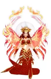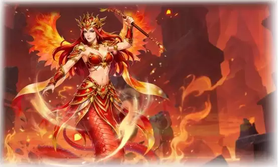 这款设计则以火焰为主题,视觉冲击力极强。红发如烈焰翻涌,身后展开的火焰宛如凤凰羽翼。下身是覆盖着红色鳞片的蛇尾,金红色的战甲衬托出飒爽身姿。形象兼具了创世的慈悲与护世的威严,仿佛补天的神力正透过熊熊火焰倾泻而出,守护着世间安宁。