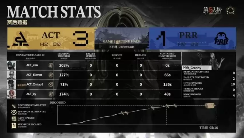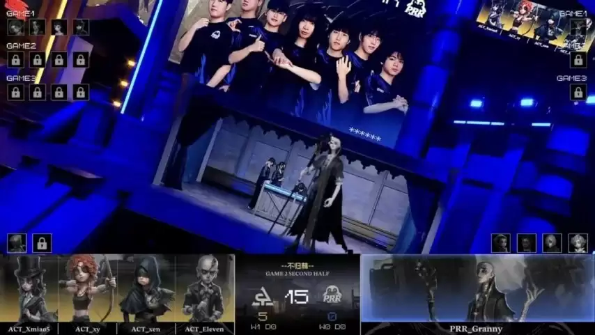 最后一轮,ACT的求生者选择了幻灯师、弓箭手、先知和“逃脱大师”,并禁用了“爱哭鬼”;PRR的监管者Granny拿出隐士,禁掉了医生、咒术师、守墓人和气象学家。