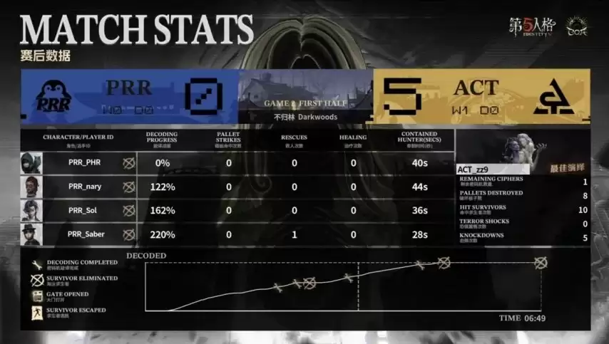 然而,在决定性的开门战中,zz9的时空之影没有给对手任何机会,将剩余的求生者逐一淘汰,完成了一场漂亮的四抓。凭借这个压倒性的表现,ACT在第一局下半轮以5:0的比分取得了巨大领先。
