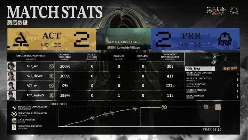 比赛伊始,双方在阵容选择上就展开了博弈。ACT求生者方拿出了魔术师、古董商、木偶师和大副的组合;而PRR的监管者Trap则锁定了时空之影,并选择禁用了医生、幻灯师、咒术师和飞行家。