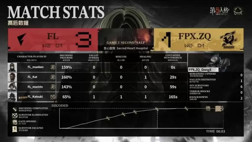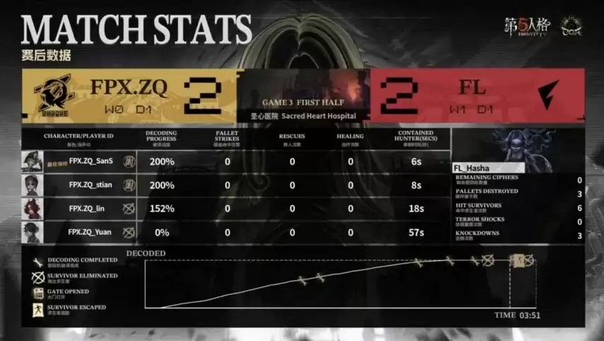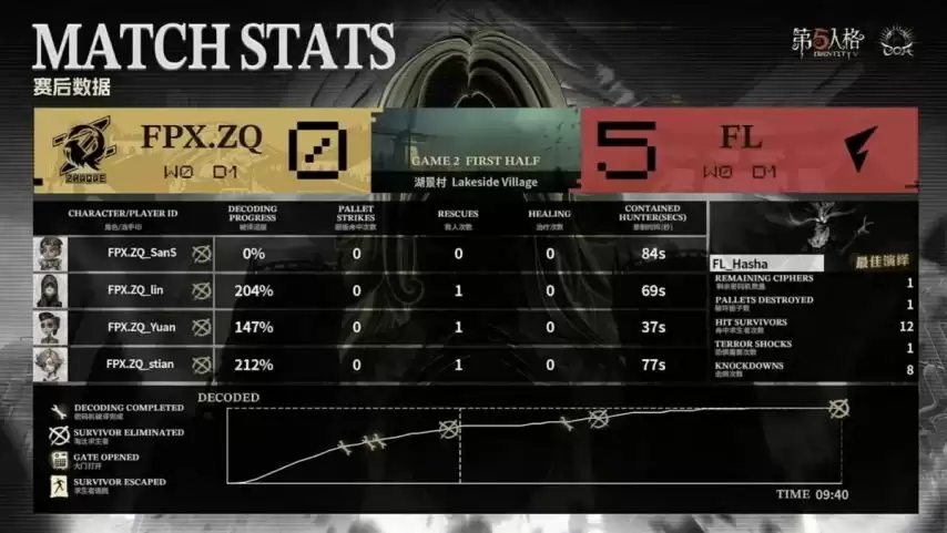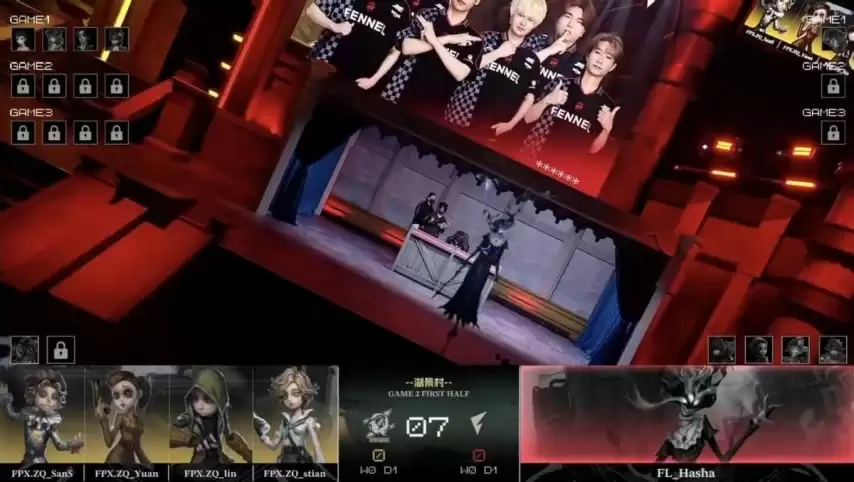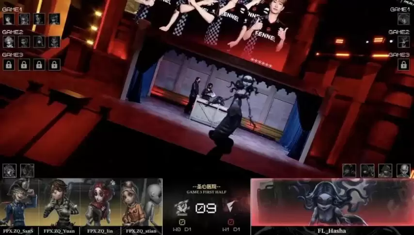 决胜局开始。FPX.ZQ求生者选出火灾调查员、“囚徒”、“哭泣小丑”、机械师,BAN掉“台球手”与“跛脚羊”;FL监管者Hasha再选梦之女巫,BAN掉前锋、先知、飞行家及“逃脱大师”。