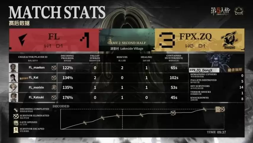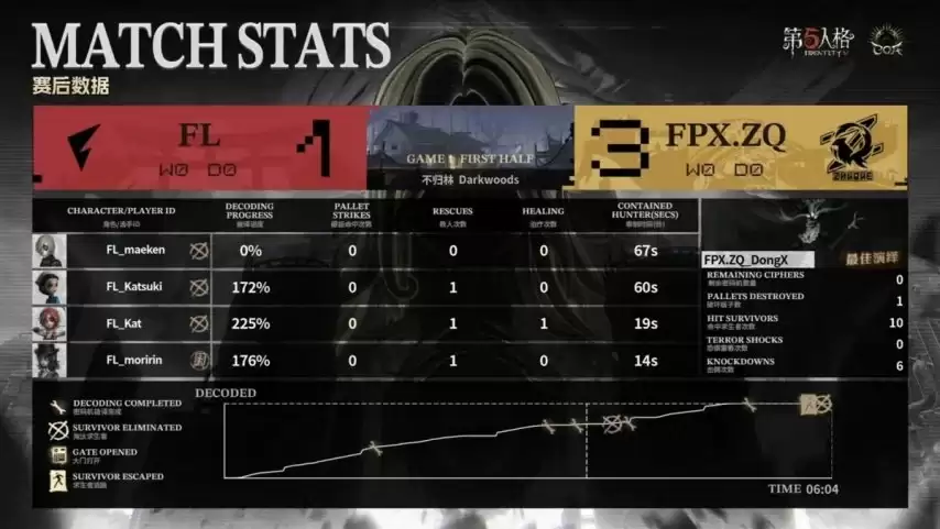 BP阶段,FL求生者选出弓箭手、幻灯师、守墓人、医生组合;FPX.ZQ监管者DongX选用时空之影,BAN位针对先知、大副、木偶师及咒术师。