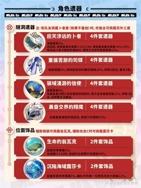 遗器搭配首选【繁星璀璨的天才】四件套。该套装提供量子属性伤害提升,并对量子弱点目标附加无视防御效果,极大强化了欢愉主的爆发能力。位面饰品方面,【停转的萨尔索图】两件套是近乎必选方案,其提供的暴击率提升与追加攻击增伤,与该命途机制完全吻合。
