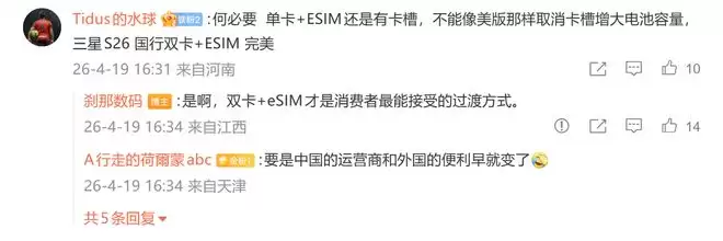 这一潜在变化迅速引发了用户热议。评论区有观点提出:“为何不效仿美版,直接取消实体卡槽以换取更大电池容量?像三星S26国行版那样提供双卡+eSIM,才是更理想的解决方案。” 博主对此回应称:“双卡+eSIM确实是消费者更易接受的过渡方案。” 这直接触及了eSIM技术普及过程中的关键议题:如何在推进技术革新的同时,兼顾不同市场用户的实际使用习惯与需求。