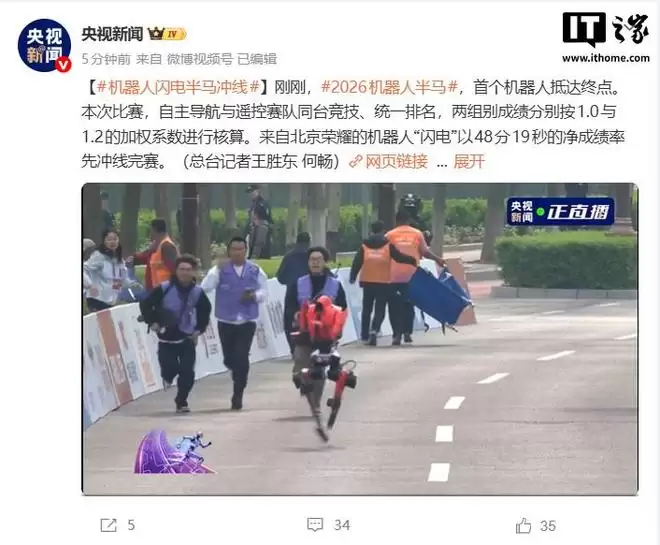 根据央视新闻发布的赛事结果,北京荣耀旗下的人形机器人“闪电”以48分19秒的净成绩率先完成21.0975公里赛程,夺得人形机器人组别冠军。