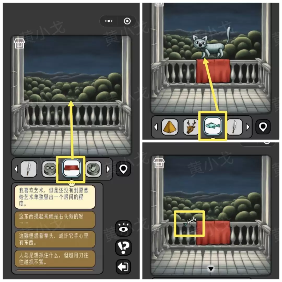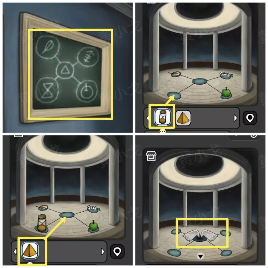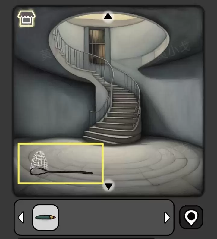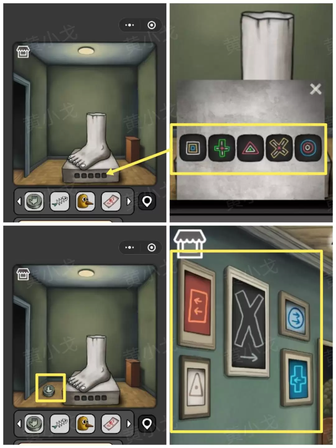 27. 同样,点击这个雕塑的底座机关。这次的调整线索,藏在[小屋-楼梯口]场景的画框图案里。解谜后,获得第二个【按钮】。