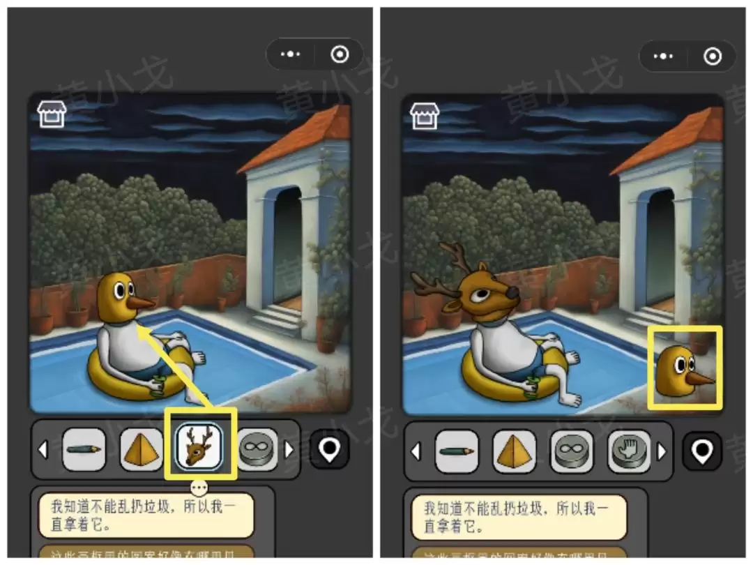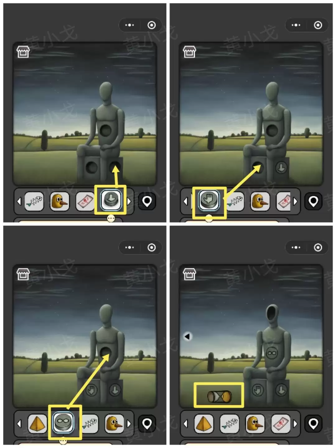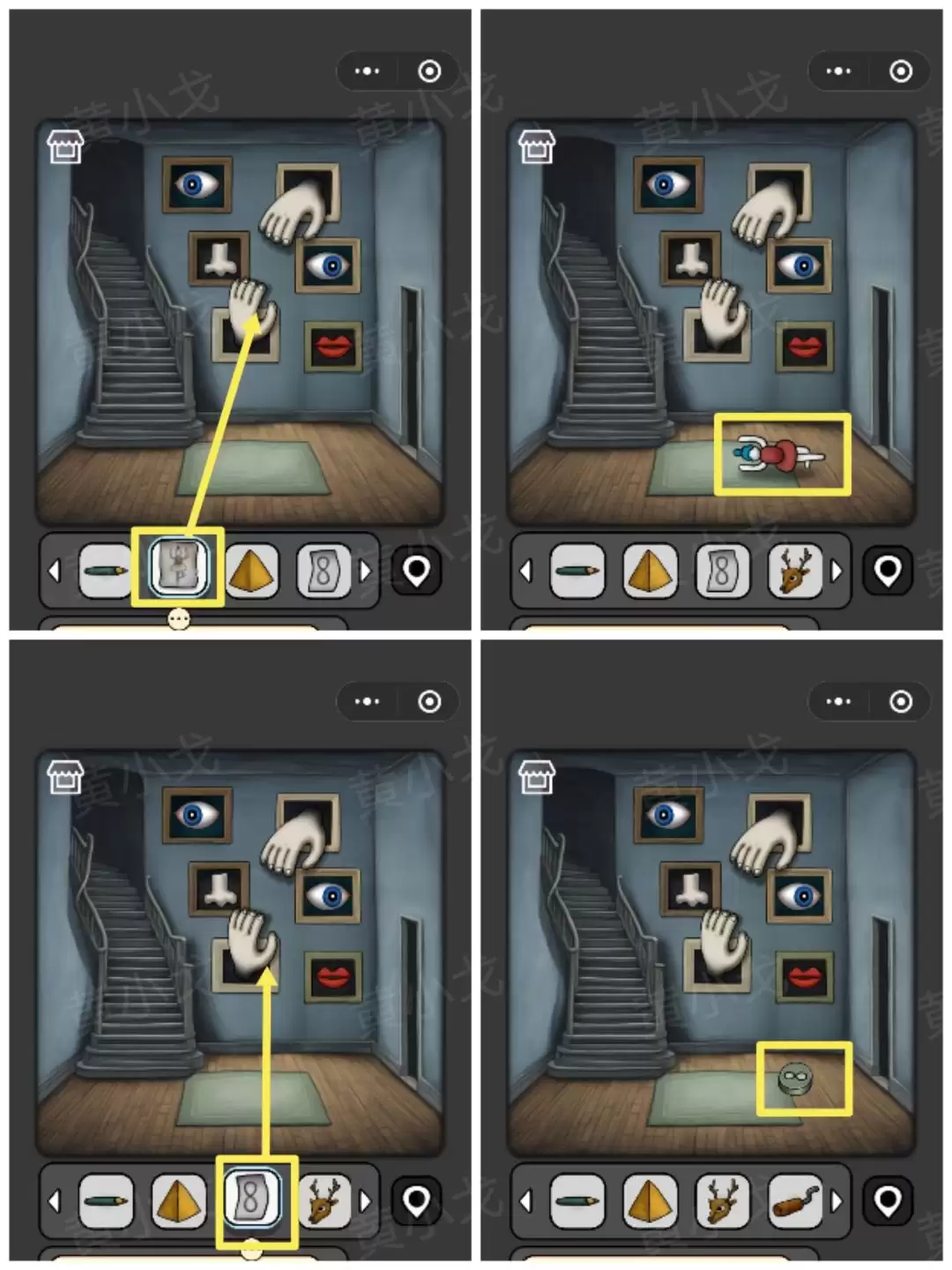 27. 同样,点击这个雕塑的底座机关。这次的调整线索,藏在[小屋-楼梯口]场景的画框图案里。解谜后,获得第二个【按钮】。