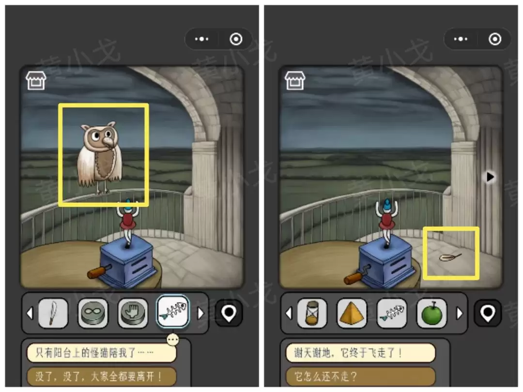 21. 看到那只猫头鹰了吗?多点它几次,把它赶走。之后,拾取它掉落的【羽毛】。