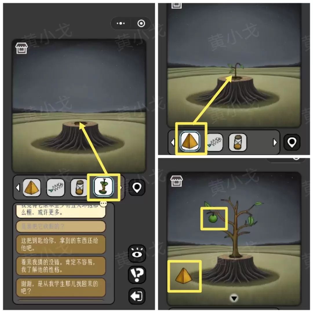31. 回到最初的树桩,把【苹果仔】放上去,然后使用【金字塔】。见证奇迹的时刻——苹果仔瞬间长成树苗,并结出【苹果】。别忘了,【金字塔】要记得拿回来。