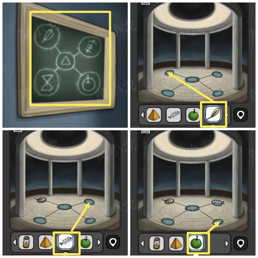 32. 最终解谜环节。根据[剧院-楼梯]场景黑板上的线索,将五样道具摆放到阵法的正确位置: