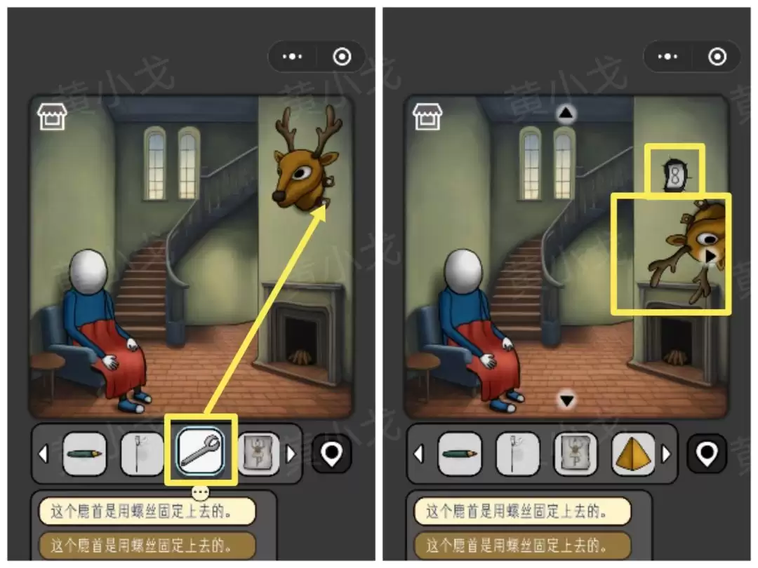 5. 用刚才拿到的【扳手】拆下鹿首上的螺丝钉。暗格打开后,里面的【纸条】和【鹿首】一并到手。