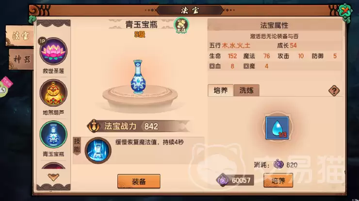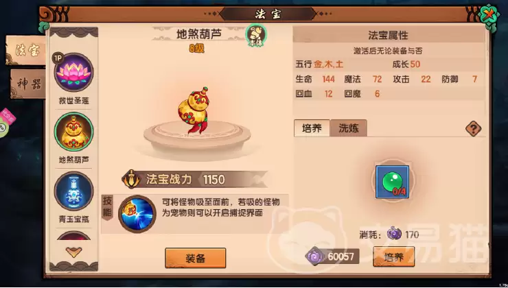 游戏里的法宝,按五行分门别类,金、木、水、火、土各有侧重:金系主攻,木系强化技能,水系扩蓝,火系加血,土系堆防。而地煞葫芦的独特之处,就在于它身兼木、土双属性。这意味着什么?简单说,它让输出效率和生存能力不再是单选题,而是可以协同提升的复合优势。