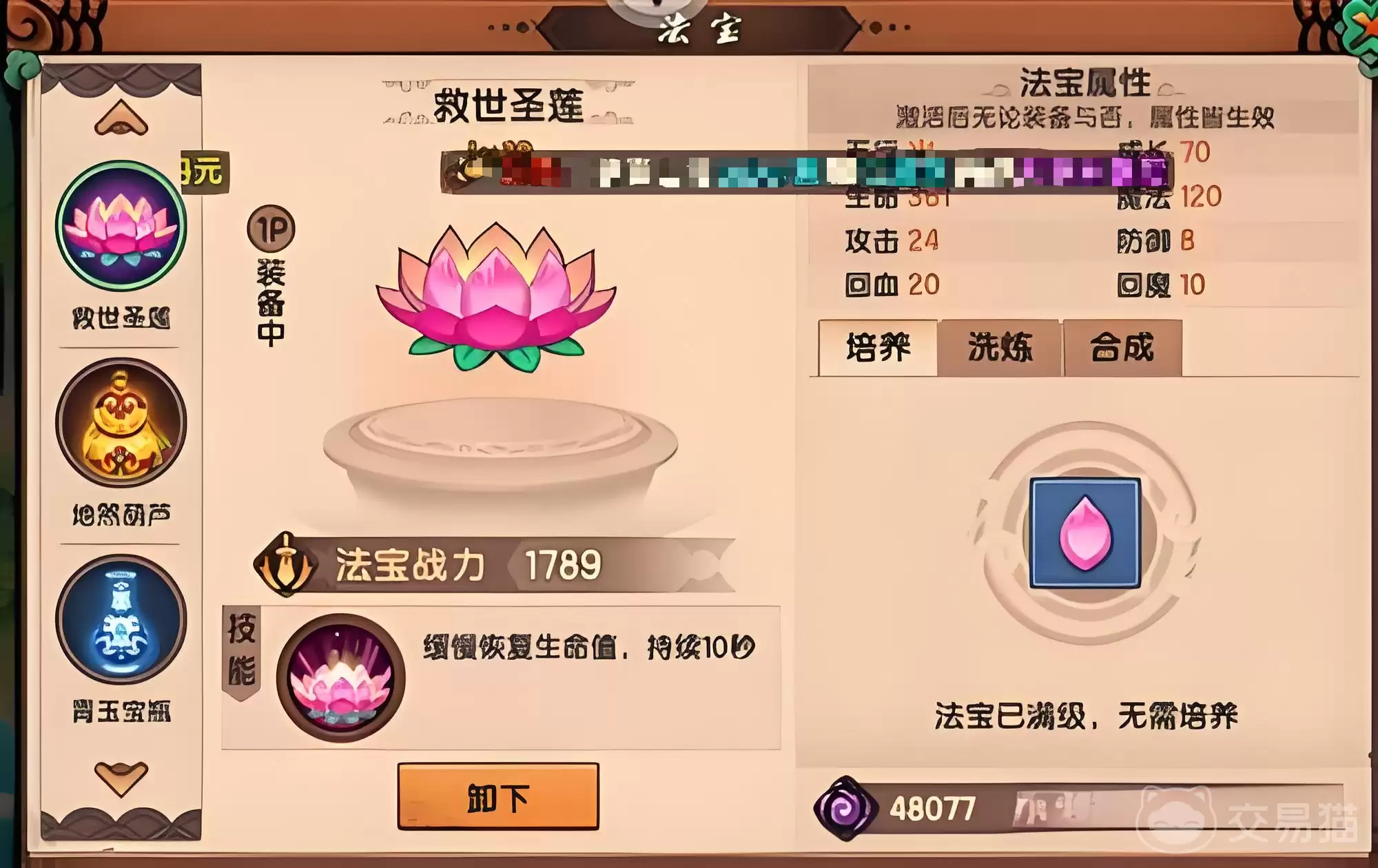 具体到属性面板:40点成长值、86点生命、43点魔法、9点攻击、4点防御,同时还附赠每秒7点生命和4点法力的恢复效果。综合来看,这份数据单透露出的信息很明确:它没有明显的短板,在续航、生存和技能强化几个关键维度上表现得相当均衡。这种均衡,恰恰是成长型法宝高培养价值的典型特征。至于怎么获得它?路径很清晰:前往花果山区域的妖树林地图,找到那个特定的BOSS并击败它,就有机会让地煞葫芦成为你的战利品。