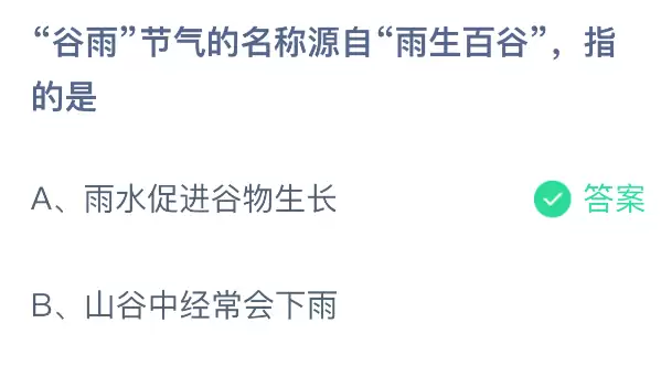 以上就是关于“谷雨”节气的名称源自“雨生百谷”,指的是?支付宝蚂蚁庄园2026年4月20日答案最新的全部内容。更多相关攻略,请关注本站更新!